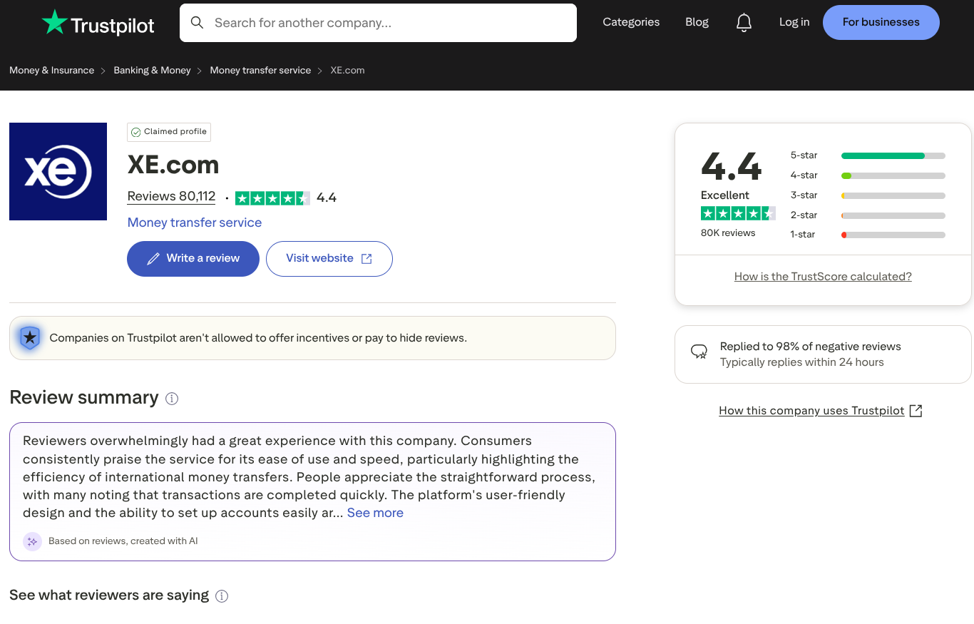 On XE’s Trustpilot page, they have over 80,000 reviews with a 4.4/5 average rating (as of writing).